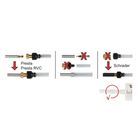 Remove the Presta valve adapter portion of the metal fitting (the first metal piece on the end of the injector tube). Then attach the metal fitting at the end of the Caffelatex injector tube to the Schrader valve.
